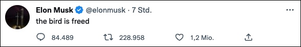 Elon Musk bestätigte den Kauf auf Twitter nur indirekt mit dem Tweet „the bird is freed“ also zu deutsch „Der Vogel ist befreit“.