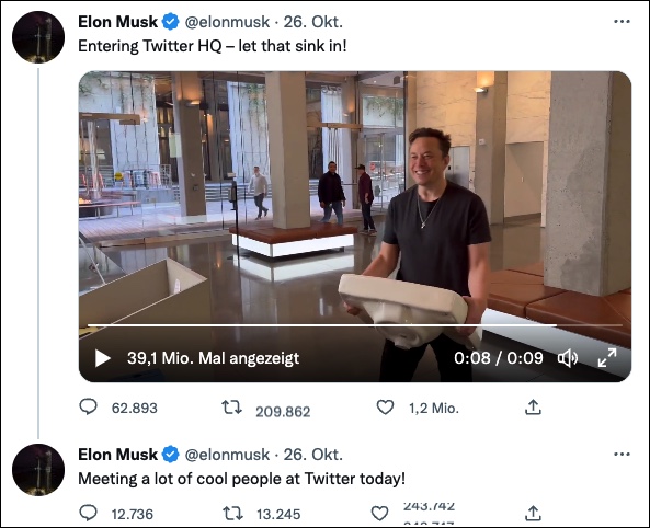 Zuvor teilte er schon auf Twitter ein Video, in dem zu sehen war, wie Elon Musk mit einem Waschbecken in der Hand in die Twitter-Zentrale marschiert, mit den Worten „let that sink in!“ (lassen Sie das auf sich wirken!) da Sink im Englischen sowohl für Waschbecken als auch für Wirken lassen steht, hielt er es wohl für eine gutes Wortspiel.